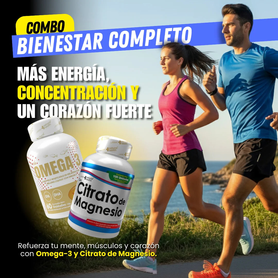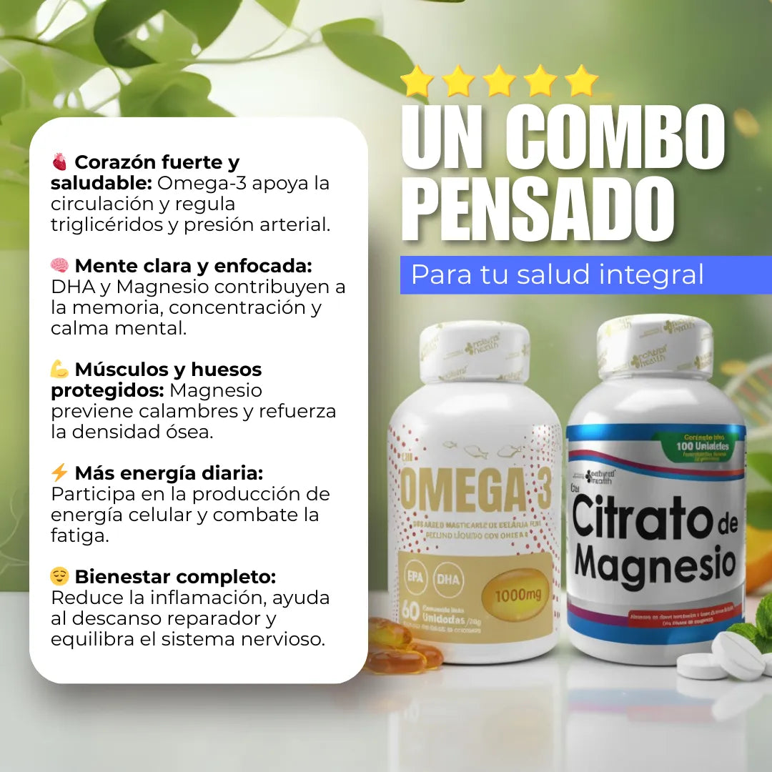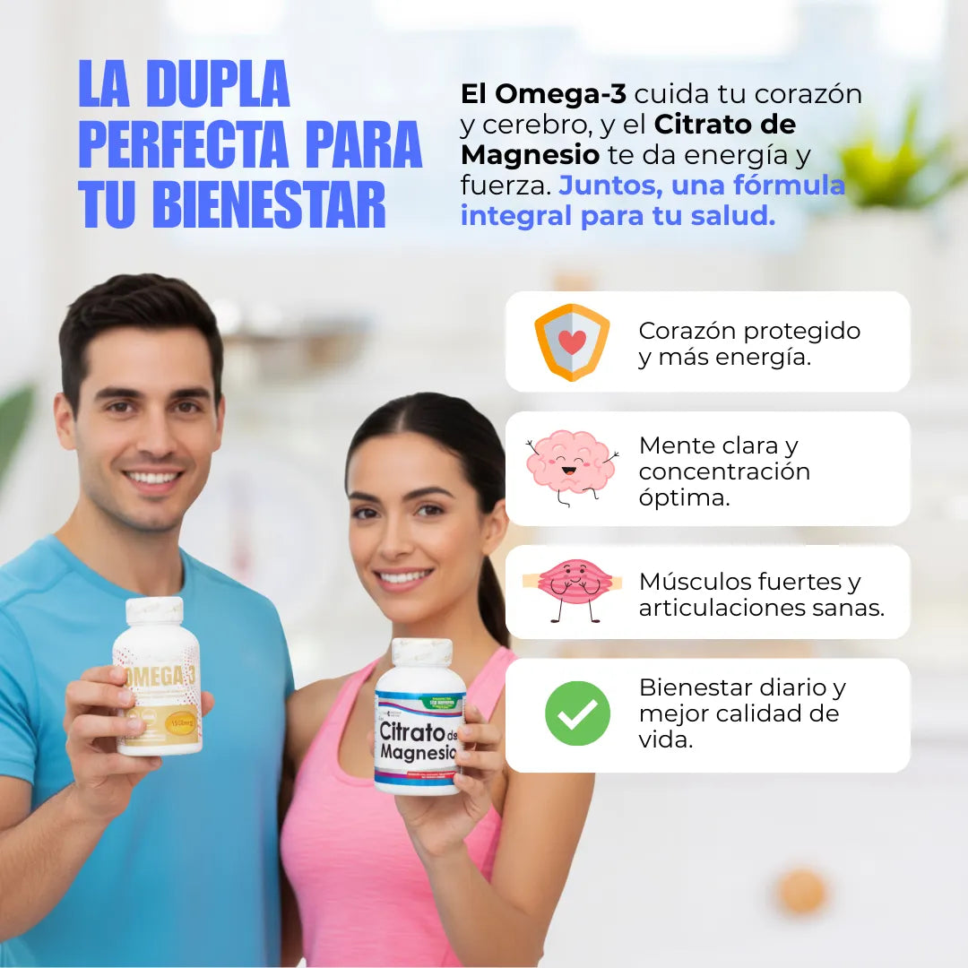 Ambos se complementan: el Omega-3 apoya la salud del corazón y el cerebro, mientras que el Citrato de Magnesio mejora energía, músculos y sistema nervioso. Juntos potencian tu bienestar general.