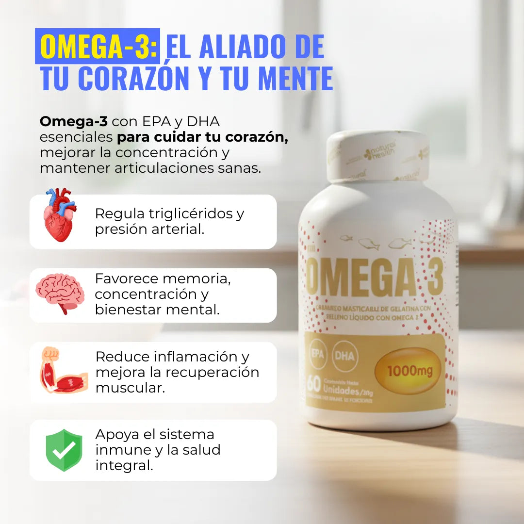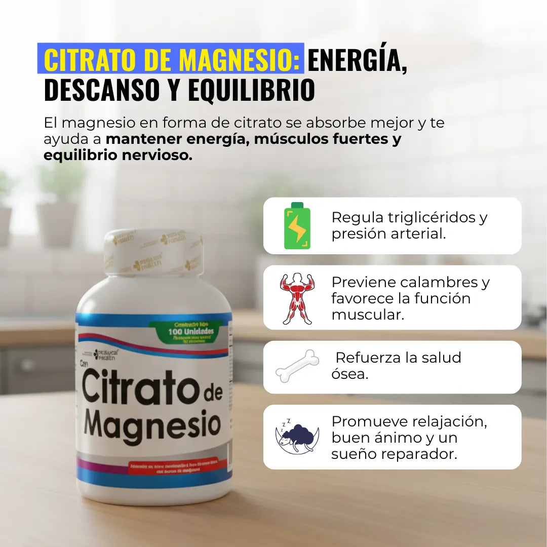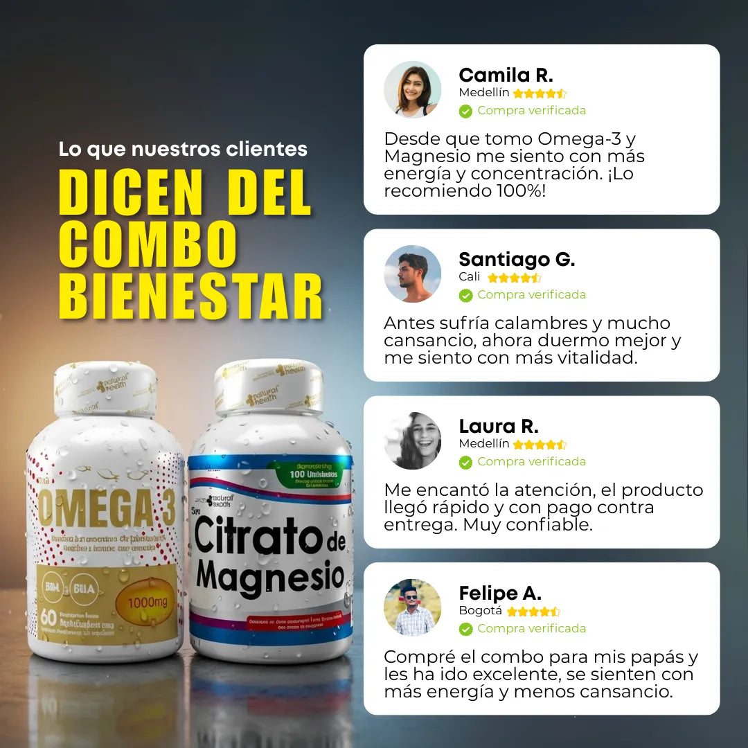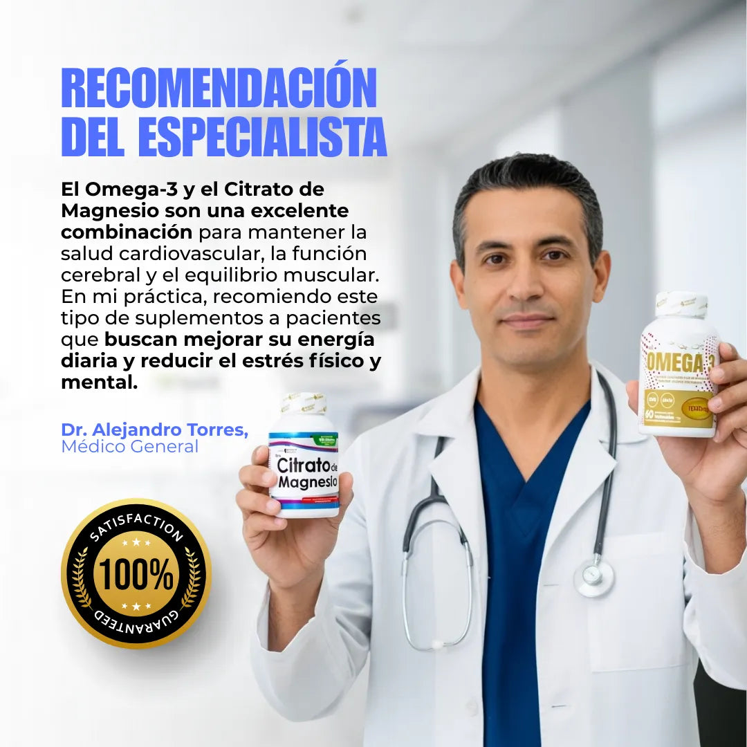 Ambos se complementan: el Omega-3 apoya la salud del corazón y el cerebro, mientras que el Citrato de Magnesio mejora energía, músculos y sistema nervioso. Juntos potencian tu bienestar general.